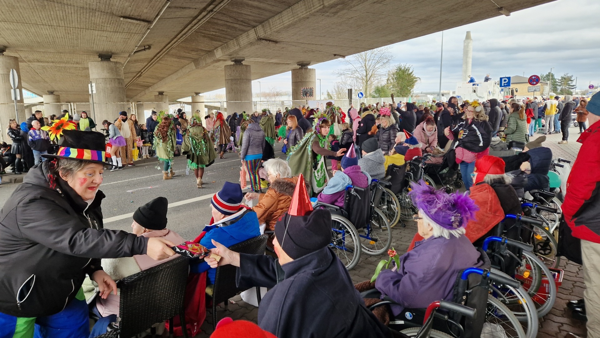 Die Höhepunkte des Umzugs waren für viele die Kamelle, die von den Wagen geworfen wurden. Mit leuchtenden Augen und voller Begeisterung fingen die Senioren die bunten Bonbons und Süßigkeiten.