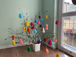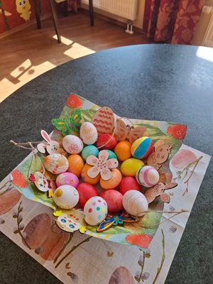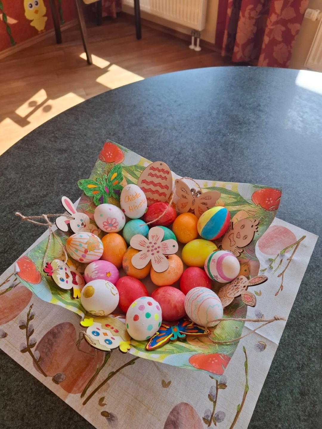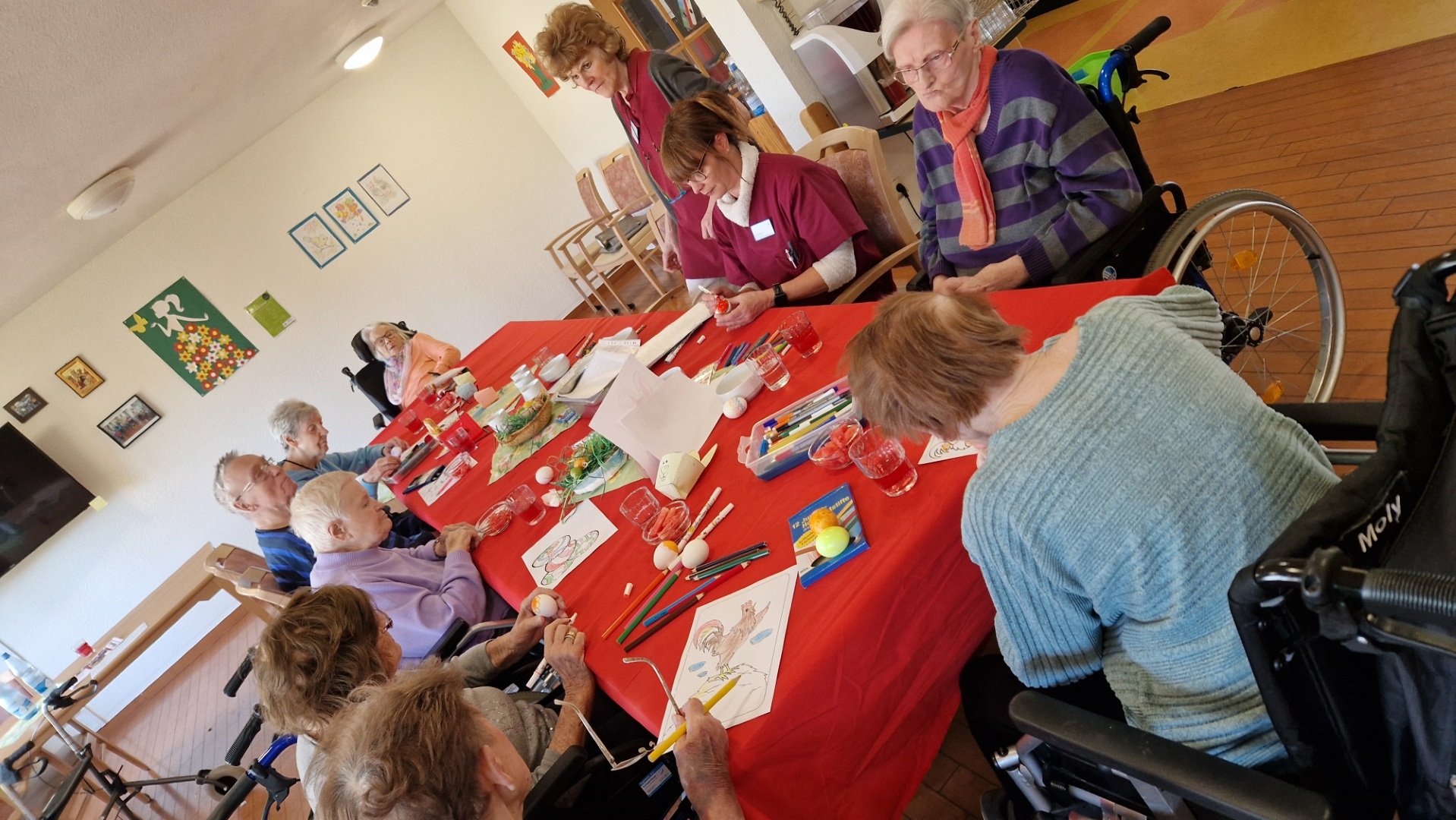 Im Seniorenheim wurde die Osterzeit in diesem Jahr besonders stimmungsvoll gefeiert. Gemeinsam kamen die Bewohnerinnen und Bewohner zusammen, um Ostereier bunt zu bemalen und ihrer Kreativität freien Lauf zu lassen. Auch das Basteln kam nicht zu kurz: Mit viel Freude entstanden dekorative Anhänger, die anschließend einen frühlingshaften Osterstrauch schmückten und für eine farbenfrohe Atmosphäre sorgten.