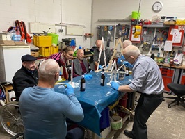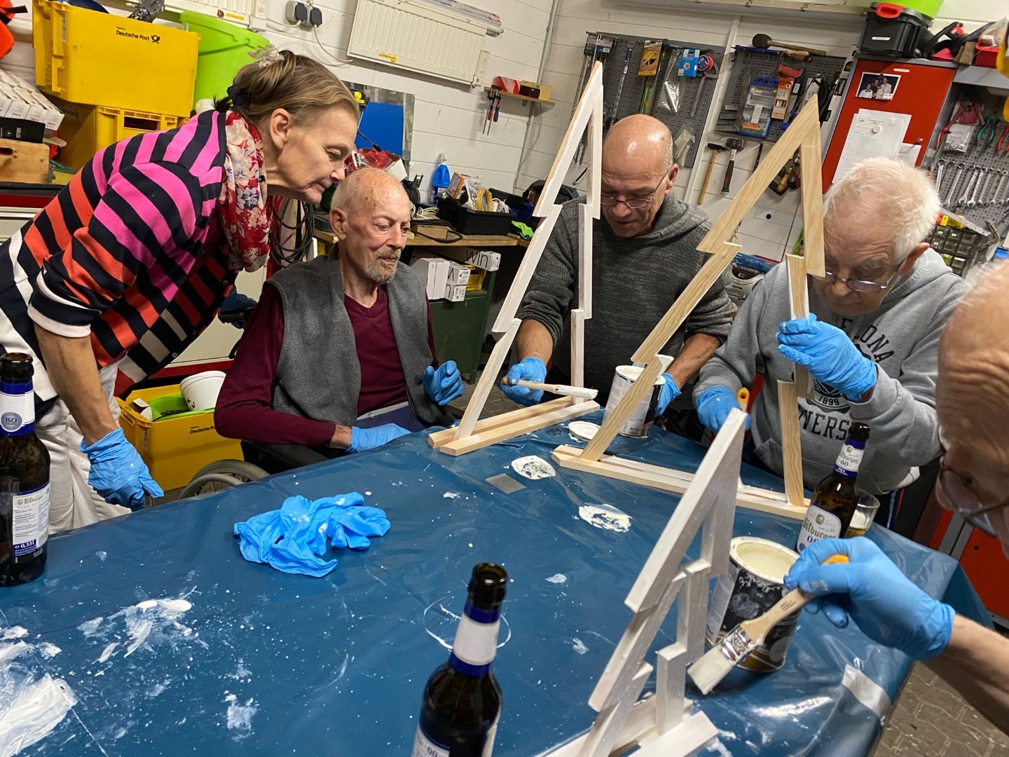 In der Seniorenwerkstatt ging es in den vergangenen Wochen lebhaft und kreativ zu. Über mehrere Nachmittage hinweg entstanden zahlreiche kleine Tannenbäume aus Holz, die nun den Eingangsbereich des Hauses festlich schmücken. Die Bewohnerinnen und Bewohner arbeiteten Schritt für Schritt an den dekorativen Bäumchen: Holzleisten wurden zugesägt, Kanten sorgfältig geschliffen und die einzelnen Teile anschließend zu stabilen kleinen Tannenbäumen zusammengesetzt. Durch die wiederkehrenden Werkstattnachmittage konnte jedes Stück mit Ruhe, Sorgfalt und handwerklicher Erfahrung gestaltet werden.